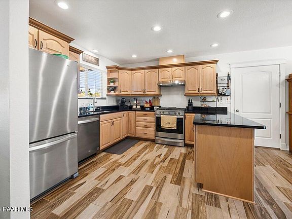 Welcome home to this charming, site-built home on a beautifully level homesite in the heart of Chino Valley. This property is a true gem, boasting a newly constructed, RV garage that offers ample space for cars, toys, or even a workshop. Nestled on nearly an acre, the fully landscaped homesite evokes a park-like atmosphere, complete with mature shade trees and lush green lawns in both the front and back, all maintained by a sprinkler and drip system. As you step inside this single-level home, you're greeted by a great room designed for comfort and relaxation. The open-concept layout flows seamlessly into the kitchen, which is a chef's dream. Outfitted with sleek granite countertops and a full suite of stainless steel appliances, it's perfect for preparing meals and entertaining.