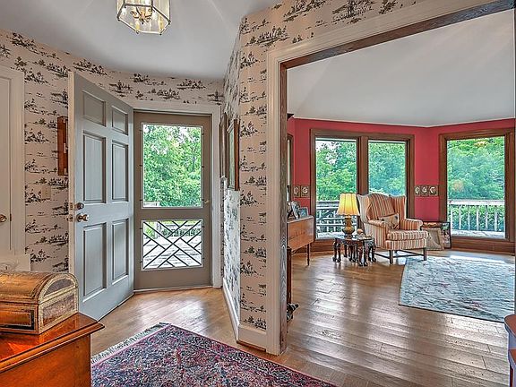 Riverfront homes overlooking the South Fork Holston river on 10+ acres are a rare find. Total privacy is assured by a long driveway through the wooded hillside which finally reveals this sprawling paradise. The home is on a knoll, well out of the rivers reach and is centrally located on the property. Walk around the home to find over 1,500 sq ft of deck overlooking a 1,000 ft of river frontage adjoining several acres of fenced back yard. West of the main house, find a restored log cabin/guest cottage on the river. East of the main house is a fenced paddock, two stall stable and a fenced tennis court. A workshop with attached dog kennel adjoins a 2 bay storage garage for carriages or a riding mower. In the manicured North woods, you find a run-in shed for horses and hay storage. From the circle drive the homes front dr./foyer is on the left front corner facing the river. Entering the foyer the bright living room is on the left and the dining rm. is to the right. The walls of glass and