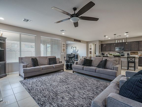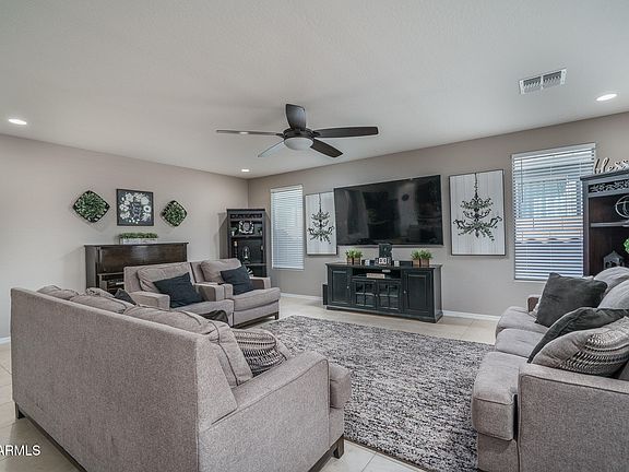Welcome to this original-owner home in Sundance that offers 4 bedrooms + a den with custom French doors and 3.5 baths in 2638 SqFt with an open great room layout and split bedrooms. The kitchen features dark maple cabinetry, granite countertops, stainless appliances, a walk-in pantry and a large island with breakfast bar & pendant lighting. Sliding doors lead out from the dining area to the covered patio and a large backyard with mountain views and plenty of room for a pool. The primary bedroom has an en-suite bath with an extended dual sink vanity, oversized shower, and a walk-in closet. Secondary bedrooms also have walk-in closets, and one also has an en-suite bath, perfect for guests. Other features include a spacious laundry room with built-in folding counter, upgraded light fixtures and ceiling fans, tile floors in living areas and den, carpet in bedrooms, neutral two-tone paint throughout, multiple linen closets, a powder room for guests, a soft water loop, and a 2-car garage.
