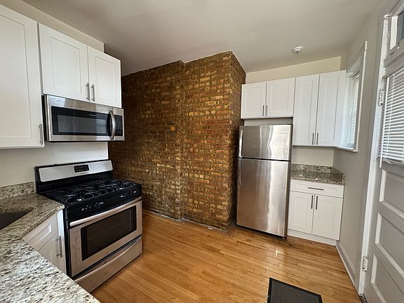 Sunny Large 1 bedroom on the second floor. exposed brick walls in hallway, bedroom wall and living room area. The bedroom is a great size will accommodate a queen size bed with a large closet. The living room is very large has hallway coat closet, sanded floors throughout, ceiling fans.