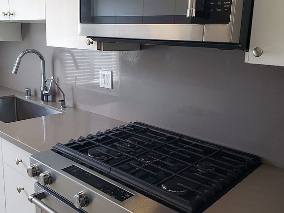 Ground floor apartmentNew chrome grohe fixturesQuartz countersStainless steel appliancesWood like laminate flooring