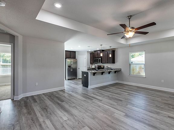 Gorgeous Florida Cottage like new with front porch. 3 bedroom and 2 bath with LVP flooring with carpet in bedrooms. Built in 2021. Open concept with neutral colors. Trey ceiling in Master and Living Area. Kitchen has granite and door to walk out back into the backyard. Breakfast bar overlooks kitchen. Frig comes with. Extra clean and ready to move in this property boasts a large fenced yard. Excellent opportunity for first time home buyer or investor. Still smells new! Garage is 10x20. Back patio is 10x16. Great location close to beaches and shopping. It has a feeling of privacy because it is tucked back in neighborhood and not a lot of homes across from it. Great property for the price!
