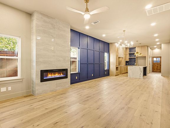 Modern tiled fireplacePrivate backyard oasisTwo-car electric garageAmple natural lightCeiling fansSpacious bedroomsSpa-like feel