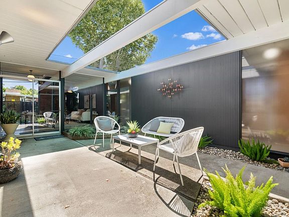 Coveted atrium model Eichler home with well preserved Eichler elements throughout, such as vinyl tile flooring, radiant heating, globe lighting, mahogany paneling, and formica countertops in kitchen and baths. The central open air atrium has a koi pond feature, river rock surround and multiple access points into the home. Inside youll find an open living and dining space with a brick wood fireplace. The back side of the home features 10 tall tongue and groove ceilings with floor-to-ceiling panels of glass, providing light and sightlines into the low maintenance landscaped yards. The kitchen and family sitting area has formica countertops, flat panel wood and laminate cabinetry, spacious peninsula with bar seating, gas range and sliders to both patio and atrium. The primary suite has a walk-in closet, en suite bath and sliding door access to the backyard. The hallway bath has an iconic boomerang formica countertop and door to the side yard. Attached two car garage. Built-up Modified Bitumen Roof. Idyllic location with Booksin Elementary and active Fairglen Eichler community block parties. Close to Wallenberg, Kirk and Lincoln Parks and just minutes to downtown Willow Glen shops, restaurants, library and weekly Farmers Market, as well as downtown Campbell and Pruneyard Shopping.