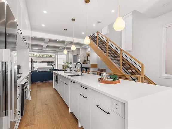 Located in the highly sought-after community of West Hillhurst, this exceptional two-storey home offers over 3,100 square feet of developed living area that blends refined luxury with timeless European-inspired design. Custom-built by Deanmark in 2023, every detail reflects superior craftsmanship and quality materials. With four bedrooms and three and a half bathrooms, this residence delivers both sophistication and functionality for modern family living.The inviting foyer sets the tone with tile flooring and a built-in bench, while wide-plank engineered hardwood extends seamlessly throughout the rest of the main level. Ten-foot ceilings and eight-foot solid core doors enhance the sense of height and elegance, while large windows fill the home with natural light. The open-concept layout connects the kitchen, dining, and living areas, creating an ideal setting for everyday living and entertaining alike. The kitchen is a showpiece, featuring sleek white cabinetry, quartz countertops, a massive waterfall island with seating, and premium Fisher & Paykel stainless steel appliances, including a gas cooktop. Ample storage and workspace make it as functional as it is beautiful. The adjacent dining area easily accommodates family gatherings, while the living room exudes warmth with its linear gas fireplace, tile surround, custom built-in display shelves, and coffered ceiling. A stylish two-piece powder room with a stone pedestal sink finishes the main floor. Upstairs, nine-foot ceilings and thoughtful design create a calm retreat. The primary suite is a luxurious escape, featuring soft carpeting, a spacious walk-in closet with custom shelving, and a spa-like ensuite with heated tile floors, dual sinks, a soaker tub, and an oversized shower. Two additional bedrooms, a four-piece bathroom, and a convenient laundry room round out the upper level. The fully developed basement features 9’4” ceilings, oversized windows, and a bright, open layout. A large recreation room with a sleek wet bar, complete with sink, beverage fridge, and wine display, creates an inviting space for entertaining. A guest bedroom, three-piece bathroom with steam shower, and dedicated storage add functionality. Outside, the backyard offers a concrete patio and grass area leading to a double detached garage with alley access. Hunter Douglas blinds and central air conditioning add year-round comfort. West Hillhurst is one of Calgary’s most desirable inner-city neighbourhoods, known for its blend of family-friendly charm and urban accessibility. You’re within walking distance to the vibrant shops, cafés, and restaurants of Kensington, offering an unmatched lifestyle. Families will appreciate being just a 15-minute walk from both Queen Elizabeth Schools. Nearby parks and the Bow River pathways provide endless opportunities to enjoy the outdoors, while commuting is effortless with easy access to major roadways and transit. Check out the 3D tour for a closer look!