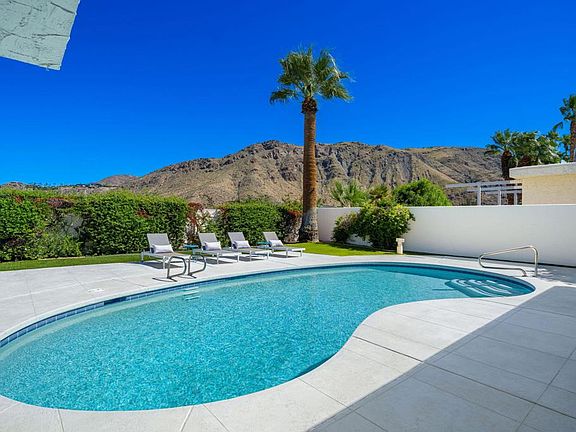 Welcome to Canyon Estates, a distinguished community renowned for its mid-century architecture in South Palm Springs. This executive home, designed by acclaimed architect Charles DuBois, showcases exceptional mid-century modern design elements including high ceilings, clerestory windows, and expansive walls of glass that seamlessly integrate indoor and outdoor living spaces .The property offers panoramic mountain views, a pool, hot tub, and several leisure areas on an expansive, private lot. A gated entryway opens to an elegant floor plan comprising 3,137 square feet, remodeled with contemporary features and conveniences. Notable upgrades include new driveways and walkways, updated gates, and 23 owned solar panels with backup battery support. The roof was replaced in 2019. Additional highlights feature porcelain tile flooring, new sliding doors, double-pane windows, a comprehensive water filtration system, and a gourmet kitchen equipped with a Cambria Quartz island, G.E. Monogram Series appliances, and custom cabinetry. The spacious living room boasts a floor-to-ceiling custom fireplace and direct access to outdoor patios, ideal for entertaining. The primary suite offers stunning mountain vistas and includes a luxurious bathroom with a granite walk-in shower. The well-designed layout encompasses four bedrooms, three and a half bathrooms, a formal dining area, laundry area, and a two-car garage. This property is situated on fee land, providing added value. Select furnishings may be available under a separate agreement outside of escrow. Homeowners Association amenities include access to a nine-hole golf course, clubhouse, fitness center, and tennis/pickleball courts. Call for your private showing today!