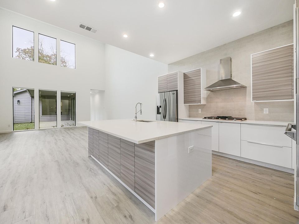 Amazing floorpan with 25 foot ceilings and floor to ceiling windows. Master Bedroom down with gorgeous bath and walk through his/hers closet. Over sized quartz island, gas cooktop with range. Large bedrooms upstairs. large covered private patio, small yard for pets. 8ft privacy fence, alarm system , W/D connections. Tenant pays for all utilizes, including yard and alarm. Landlord can do yard maintenance for $65 additional per month.