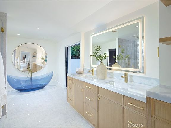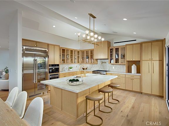 Tucked away on a cul-de-sac in Monarch Bay Terrace, this single-level 4 bed, 3.5 bath, appx. 3005 Sq Ft showpiece with panoramic ocean views has been fully reimagined, expanded, and redesigned. From the moment you arrive at the private extended driveway framed by lush, low maintenance landscaping, the home reveals itself as a rare blend of timeless coastal style and modern innovation. Step inside through a dramatic rift-cut white oak pivot door and discover wide-plank French oak floors, soaring 10-foot ceilings, and gallery-like proportions. Oversized WinDor glass doors frame uninterrupted ocean views, opening to an expansive terrace designed for seamless indoor-outdoor living. At the heart of the home, the kitchen balances form and function with a 10 foot Taj Mahal leathered quartzite island, custom oak rift-cut cabinetry with glass accents, and professional-grade appliances including a Thermador range, True commercial refrigerator, and Miele coffee station. A built-in bar with ice maker, sink, Thor beverage center and storage connects the kitchen, dining, and living spaces for effortless entertaining. The primary suite captures the coastline through picture windows and opens to a private terrace. The spa-inspired bath is finished with backlit Namibia Mystery Blue marble, a sculptural soaking tub, oversized rain shower, and dual vanities—all complemented by a fully customized walk-in closet. Two additional bedrooms share a designer bath, while a fourth bedroom suite offers flexibility as live-in quarters, guest casita or as a multi-generational living space with its own entry, ensuite bath, bar sink and private patio. Multiple lounges, TimberTech decking, stainless cable railings, and a built-in sound system create a resort-like setting with the Pacific Ocean as the backdrop. The three-car garage showcases reflective full-view doors, marble-look epoxy flooring, and EV-readiness, doubling as a stylish showroom. Modern conveniences abound with all-new plumbing and electrical, tankless water heater, high-efficiency HVAC, whole-home automation, Sonos audio zones, and smart security, the residence delivers the peace of mind of new construction with the warmth of thoughtful design. 23262 Ellice Circle is more than a remodel—it’s a complete re-invention of the coastal California lifestyle, where luxury design meets everyday comfort against a backdrop of panoramic ocean views.
