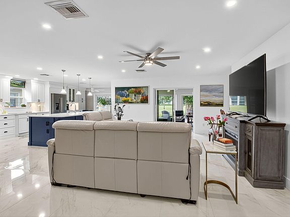 Welcome home! Come see this beautifully updated 3 bedroom 2 bath home with 2 bonus rooms & a 2 car garage on the golf course! Enter to a foyer entry &open layout with gorgeous updated large stone-look ceramic tiles. An entertainers dream, see the updated kitchen with quartz counter tops, KraftMaid cabinets, a walk in pantry & stainless steel appliances. The kitchen's breakfast area overlooks the golf course. The primary bedroom has a walk in closet & an additional large closet. Theprimary bathroom has dual vanity & a large shower. Guest bedrooms have ample closet space. The guest bathroom has a jacuzzi tub. 2 bonus rooms overlook the golf course through impact windows. Outside enjoy the summer kitchen with sweeping golf course views. New roof 2025 (flat & tiki 2018). A rated schools.