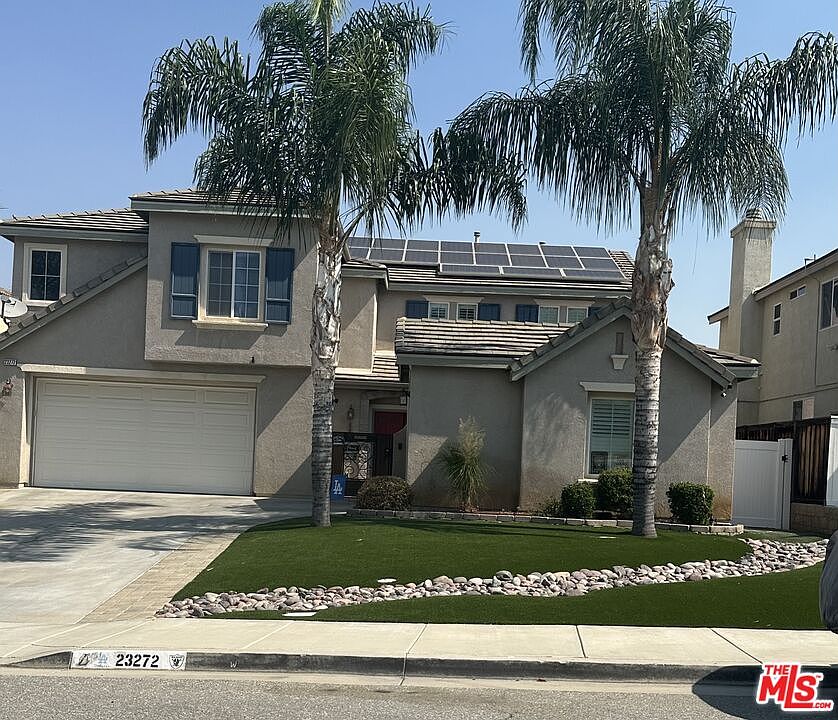 Walk through your private garden courtyard before entering the front door. The open air feeling immediately greets you as you step in. This 5-bedroom, 4-bathroom home boasts upgrades including lovely real wood flooring, custom oversized tile and plush carpet. The colors are modern and neutral. The kitchen is an epicurean delight with Quartz Countertops and custom travertine backsplash, two ovens, two microwaves and a center island. The Kitchen opens up to an extra large family room with a custom fireplace. There is a main floor bedroom and private full bath as well as a guest bath. Two of the bathrooms were completely remodeled. Fencing around the property with an 8 foot gate allowing complete privacy. Wood shutters throughout and artificial grass in the front and backyard. Fans in all the bedrooms and tastefully painted. The grand master suite includes bathroom and oversized walk in closet. Step out to the back yard and enjoy the relaxing pool with a baja step and spa. LED lighting throughout. The property has SOLAR! Think of the immense savings on electricity! This home is one of a kind in this area and will not last!