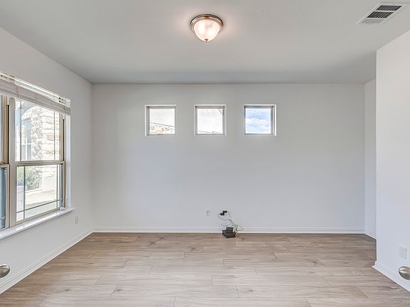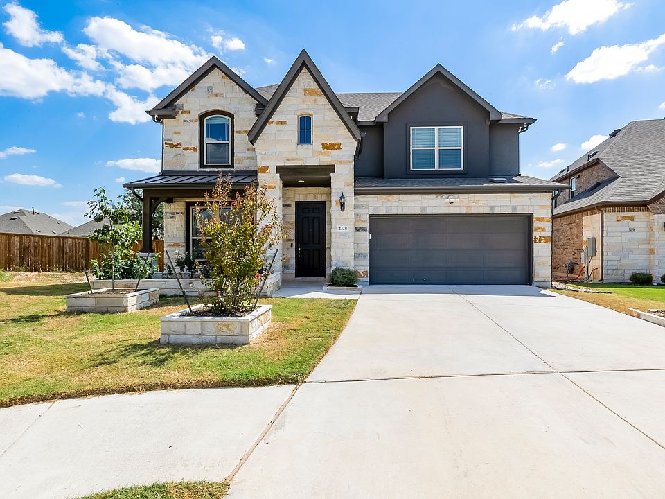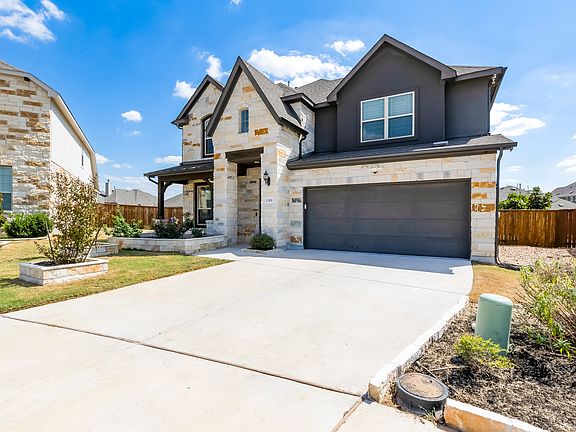 Built in 2021, this 3,121 sq ft single-family residence in Leander offers 4 bedrooms and 2.5 bathrooms with a functional layout and modern finishes. Located in cul de sacThe entry hallway welcomes you with light wood-style flooring, recessed lighting, and high ceilings. The kitchen is a centerpiece of the home, featuring decorative light fixtures, a large center island with sink, light stone counter-tops, a tasteful back-splash, stainless steel appliances including cook-top, refrigerator, microwave, dishwasher, and a walk-in pantry. The open floor plan allows for seamless flow between living, dining, and kitchen areas. A private bedroom with adjacent study is located on the main level, providing flexibility for guests or a home office. The remaining bedrooms are located upstairs, offering privacy and comfort. Bedrooms include vaulted ceilings, ceiling fans, and light wood-style flooring, while bathrooms are finished with vanities, a washtub/shower combination, and patterned tile floors. The laundry room is equipped with a washer, dryer, and matching flooring. The backyard features a fenced lawn, stone siding accents, a shingled roof, and a covered patio area ideal for entertaining or relaxing outdoors. Community park is right across the street.