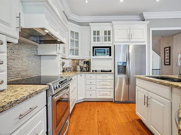 Located in the Exclusive and Sought After Woodhaven Estates backing onto the beautiful Lions Valley Park & Sixteen Mile Creek youll find this fabulous freehold end unit with walk out basement and only attached at the garage. The spacious foyer with double door entry makes a statement as you enter this traditional and elegant 4 BR, 2+2 bath home with stunning treed views from all three levels and offering features like, gorgeous hardwood spiral staircases, 2 gas fireplaces; pot lights, hardwood floors and crown moulding throughout most of the home; primary bedroom with trayed ceilings, stunning view, updated gorgeous ensuite with large walk in shower, double sinks and separate soaker tub; well appointed kitchen with integrated hood range, tons of drawers, pull out spice rack, crown moulding, under cabinet lighting, granite counters, composite granite sink, and walk in pantry with laundry hook ups; living room with gas fireplace and walkout to large deck overlooking the forest; fully finished basement with large rec room walking out to fully fenced backyard and patio Beautifully landscaped, double car garage, 4 car drive, you dont want to miss out on this one!