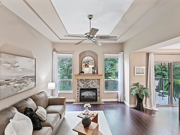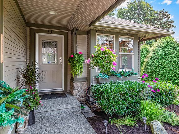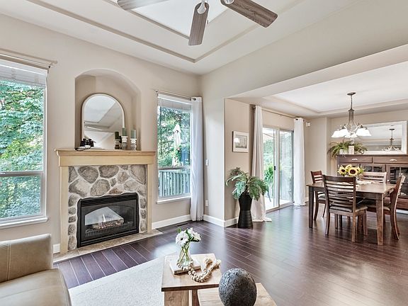 Welcome to Woodridge, one of the area's most sought-after communities! This duplex-styled 2 storey w/ a fully finished bsmt. offers 4 spacious bdrms. & 4 bthrms. And a layout designed for comfort & flexibility. Soaring ceilings in entry area & gas f/p in lvgrm. with sliders out to deck overlooking greenery &Kanaka Creek. Main floor primary suite or fam rm. Oversized upstairs primary suite with 2 W.I. closets with a spa-styled ensuite. Finished bsmt. with high ceilings, rec rm, 2 large bdrms, plus an office space & walk-out to covered patio from rec.room. Double garage PLUS xtra prkg. spot on d/way. This home combines the feel of a detached residence w/ ease of t/h living. Peaceful, private, & perfectly located- Woodridge is where lifestyle meets convenience.