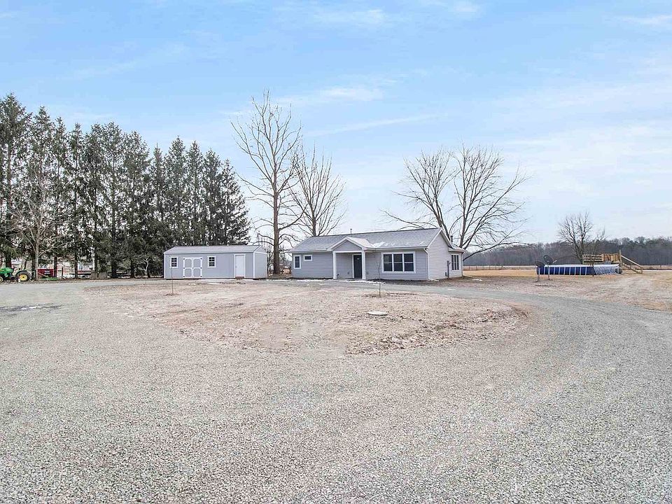 How many ways to use this property....let's count the ways! Like new home on 2.75 acres is ready for you. Currently a one bedroom home, but the septic system is approved for a three bedroom. The home was placed on the site to allow for additions to the west end. Amazing kitchen with top end appliances, tiled shower, and hook ups (and closet) for stackable washer and dryer. 1108 square foot outbuilding, garage, or personal storage is permissible without a variance. The property would be ideal for horse/barn/training. Agriculture would require a variance. Furnace is in the attic as this is the best heating system for homes with a slab foundation. The storage unit currently on the property is not included in the sale of the home but can be purchased. Pool not included. Please verify schools due to Elkhart school merger.