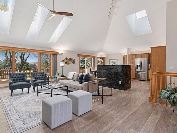 Showings will start on 5/1 at 6 pm. * Sellers are calling for Highest & Best Offers by Sunday (5/4) at 7p.m. Welcome to your dream home nestled in the heart of Chanhassen in the sought-after neighborhood of Stone Creek. This stately soft contemporary walkout Rambler is custom designed with an abundance of updated features offering the true convenience of main level living. Upon the grand entrance through the full glass double doors, you will be greeted with soaring vaulted ceilings and skylights, allowing for plenty of natural light. Luxury vinyl flooring and fresh paint throughout the main level along with beautiful finishes, and a cozy gas fireplace. The inviting open floor plan seamlessly connects the family, dining and kitchen areas including the walkout to the massive two-tier deck overlooking the lush backyard with pond views. There are three bedrooms on this level and two full baths. The primary bedroom is like walking into an exclusive retreat which offers an ensuite bathroom with dual sinks, soaking tub, walk-in private tile shower, and separate toilet. There is also a huge walk-in closet, and your own private patio doors leading you to the serene backyard deck to enjoy your morning Java. The other two bedrooms are gracious in size with racetrack ceilings and fans. The gourmet kitchen is a chef's dream with all stainless steel appliances, custom cabinets, double convection ovens, gas cooktop, granite tops, backsplash and an island. The large mudroom offers a new washer and dryer, utility sink, plenty of cabinets with countertops and a closet. The finished lower level walkout has new carpet and fresh paint throughout. There are many spaces to entertain such as the great room with a wood burning fireplace, entertainment/media area with a rough-in for a wet bar, and a flex or exercise area. In addition, there are two large bedrooms and a full bath located on this level with a walkout to the 14x60 concrete patio with electrical sub-panel for a hot tub. There is also plenty of storage on this level. Dual furnaces, one for each level 2015, Central A/C 2015, Air Exchanger 2014, Gas Water Heater 2014, and a new Roof with Architectural Shingles in 2021. The oversized three-stall garage has 8 foot doors, hot and cold soft water spigots, floor drain and accessible attic with lighting for more storage. Overall, this home has been custom designed for comfort, functionality and entertaining-inside and out. Whether you're enjoying a quiet evening on the deck or hosting in the open concept living spaces this home is ready to welcome you!