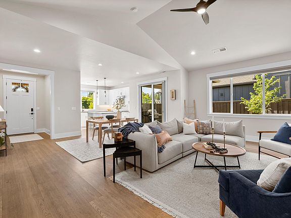 Step inside this lightly lived in, turnkey home and experience refined living in a thoughtfully designed open-concept layout. Soaring nine-foot ceilings, elegant Santa Fe wall texture, and rich engineered hardwood flooring create a seamless flow through the entry, great room, and kitchen/dining areas. At the heart of the home, a chef-inspired kitchen awaits—featuring quartz countertops, a full-height custom tile backsplash, premium built-in cabinetry, and top-of-the-line KitchenAid stainless steel appliances. The luxurious primary suite offers a true retreat, boasting a spa-like bathroom with custom tilework, a herringbone-patterned tile floor, a relaxing soaking tub, and an expansive walk-in closet. The second bedroom also features a walk-in closet, while the third bedroom provides a versatile space—ideal as a private home office. Smart home technology and upscale finishes throughout.