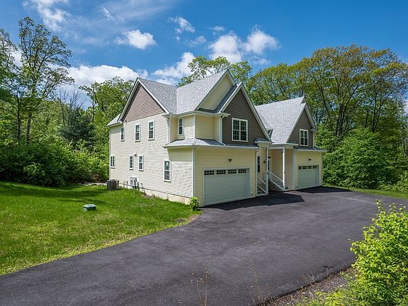 Nestled on a private, 3.28-acre wooded lot, this magnificent colonial-style home offers a tranquil retreat down a picturesque country road. The open-concept floor plan features a dramatic foyer, great room, kitchen, living room with fireplace & half bath on the 1st level. Upstairs, you'll find 3 bedrooms 2 full baths, including a primary suite with 2 walk-in closets & a glamorous bath. The second floor also has a laundry room. Gleaming hardwood floors, an upscale kitchen with ample cabinetry, granite countertops, stainless steel appliances, & a large island perfect for seating, are just some of the high-end finishes throughout. The finished, walkout lower level provides abundant natural light & a spacious family room/bonus area for added living space. Step outside to enjoy the manicured lawn, two-car garage, & ample parking, all while being conveniently located with easy highway access. A peaceful escape immersed in nature! Unit A is also available for sale. Title V passed.