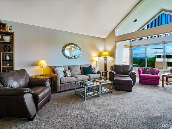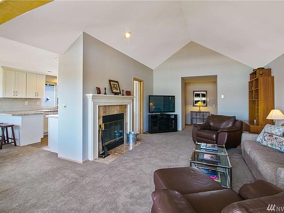 Welcome to this updated, spacious, top floor condo in the heart of the Edmond's bowl. You will instantly notice the light filled living room with high vaulted ceilings, a wood burning fireplace & Sound facing windows. The kitchen has newer cabinets, granite counter top, SS appliances. The corner location also provides Olympic mountain range and territorial views. 2 large bedrooms, including a master with walk-in closet, newer carpet throughout. 1 garage & 1 outdoor parking spot included.