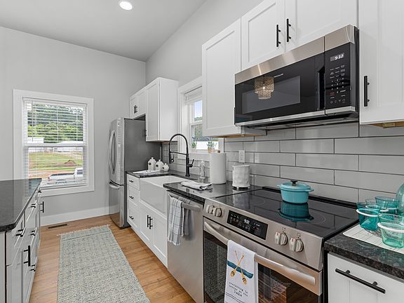 Modern farmhouse styleStainless steel appliancesShaker style cabinetsLuxurious kitchen finishesCeiling fansWood grain flooringGranite countertops