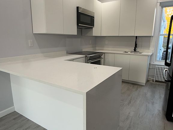 Quartz countertopsModern styleUpdated appliancesWhite cabinetsBrand-new flooringStunning kitchen