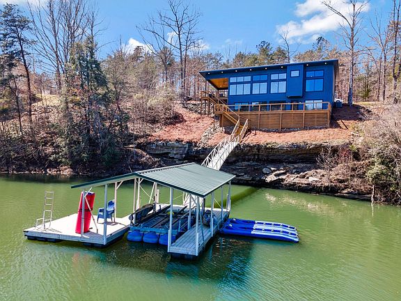 A circular concrete driveway provides ample parking, while just a few steps lead you to the water's edge, where you'll find a covered boathouse with lifts, a swim pier, and PWC ports. Whether you're looking for a private getaway or a lucrative rental investment, this lakeside retreat is ready to enjoy!