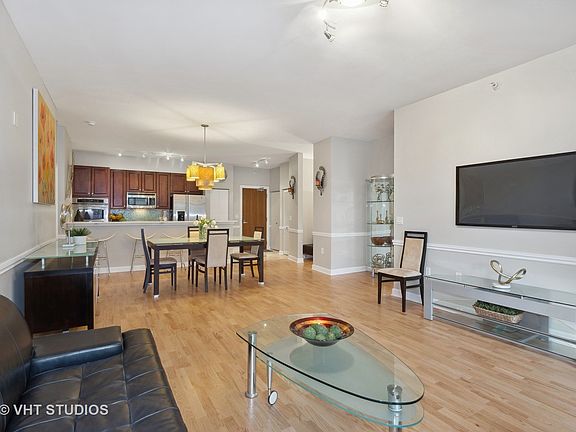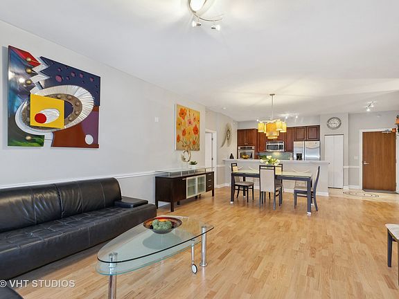 South Loop's Museum Pointe Tower 2 bedroom/2bath split layout. Plus additional den/office space. Recently upgraded with new hardwood flooring and new paint throughout. High ceilings, floor to ceiling windows and laundry hook-up in unit. Kitchen features new quartz counters, large breakfast bar, SS appliances, travertine marble flooring and tile backsplash. Spacious living room with private balcony and dining area. Large primary bedroom with walk-in closet and marble spa-like bath with soaking tub, separate shower and dual sink vanity. Private storage space on same floor. Full amenity building includes 24 hour door staff, fitness center, party room, clubhouse and outdoor pool/sundeck. Separate heated garage parking space for available for sale. Great location close to Lake, Grant Park, Soldier Field, museums, south shore transportation, shopping and restaurants!