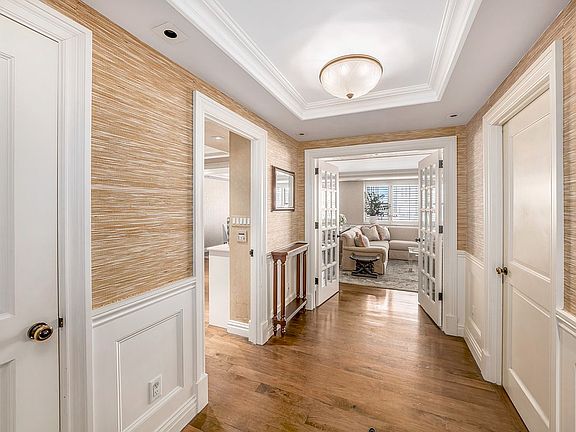 The private primary suite is set apart from the other bedrooms, creating a serene retreat. It features a spacious dressing area, ample closet space, and a luxurious Waterworks marble bathroom. In a separate wing, the second bedroom includes an en-suite marble and onyx bathroom. The third bedroom, with built-in cabinetry, is adjacent to a beautifully finished marble bathroom. The fourth bedroom, which includes a large en-suite bath and a spacious laundry room with Miele appliances is very large. It offers ultimate flexibility and can serve as a media room, home gym, or guest suite. A secondary entrance adds an extra layer of convenience.