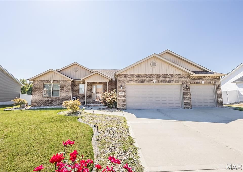 This spectacular custom-built rambling ranch is nestled in one of Madison County's most sought-after-areas just a short walk to the lake! Step inside to find beautiful flooring, a dramatic open staircase, and a spacious great room with soaring cathedral ceilings that seamlessly flows into the gourmet kitchen. The kitchen is a chef's dream, featuring granite countertops, a snack bar, dining area, and high-end appliances- with the refrigerator(2025), washer & dryer all included!