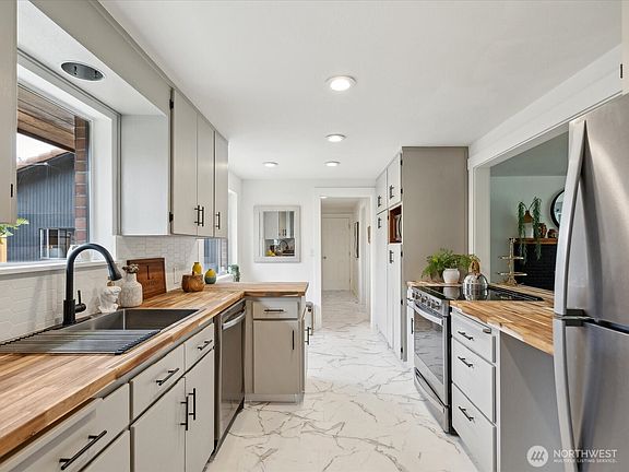 Welcome to this beautifully remodeled 4-bedroom, 2.5-bath single-story brick home! Large windows throughout the home infuse the space w/ natural light. Enjoy a fully fenced, spacious yard, oversized shed, & potential for a DADU. The generous garage/shop 24'5" x 11'3" comes equipped w/ 220V power & an attached carport 24'5" x 12'2", ample parking for RVs, boats, and multiple vehicles. Modern upgrades include LED lighting, updated electrical systems, and a durable lifetime roof. Step outside to a serene walking trail & park. 7-minute drive to Boeing & YMCA, and minutes to I-5, this home combines comfort w/ convenience. South facing home perfect for gardner's & NO HOA, don't miss this Gem!
