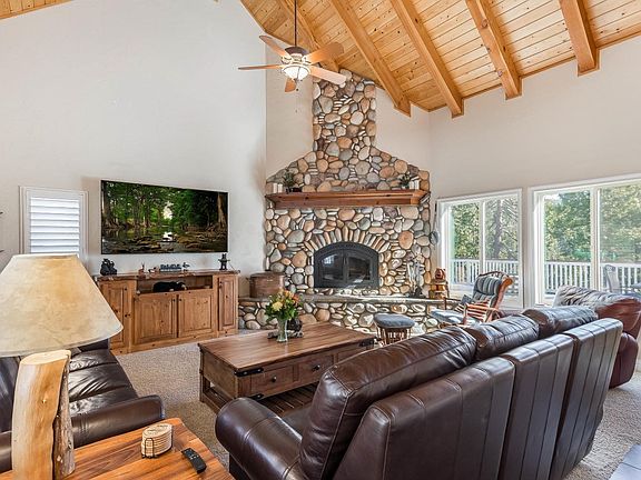 Four-bedroom, four-bath, fully-furnished home in the Blue Lake Springs sub-division, sleeps 12+ and is a dream property for a large family, as a full time residence, shared vacation home or short-term rental. With three floors of living space and two master suites (main and lower level), this house is ready to make mountain-living or vacationing dreams come true. Main floor living area offers tons of natural light with east and west-facing windows; cathedral ceilings with tongue-and-groove pine, majestic floor-to-ceiling stonework, beautiful cook's kitchen with six-burner gas range, double ovens, custom Alder wood cabinets, and tons of counter space, including counter bar, separate coffee or wine bar, and oversized eating area with plenty of room for all! Conveniently located laundry room directly off the kitchen has pantry storage, stackable washer/dryer, and utility sink. The spacious main floor master suite features custom Alder wood built-ins, a large bathroom with Jacuzzi tub and view of the forest, large double vanity, and convenient storage. Two more bedrooms upstairs plus a full bathroom and loft with additional guest area rounds out the interior of this amazing property. Oversized attached garage for parking, workshop area and storing winter or summer toys! A wraparound deck with front porch, retractable awning and plenty of sitting area in the back overlooking the lovely groomed pine forest laced with trees surrounds the home on three sides. Gently sloping concrete driveway with plenty of parking and easy snow-removal on the priority-plowed road in front. The Snowflake Lodge & Blue Lake Springs recreation center with swimming pool, basketball and tennis courts, restaurant, private lake, grassy picnic and amphitheater area sits just steps away, directly behind the property. Bear Valley Ski Resort is just a straight shot up Highway 4, and plenty of other summer recreation areas close by.