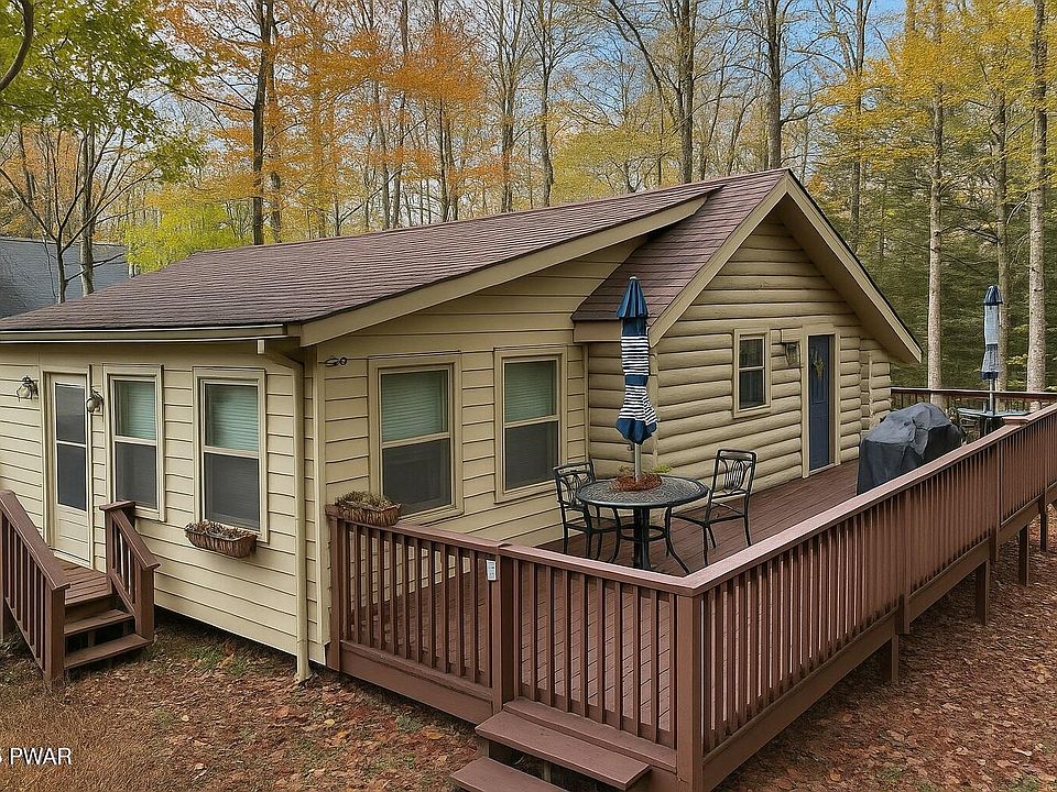 Real log cabin exudes rustic charm and is located in a 5 star award winning Poconos community! The home has been recently renovated including a brand new roof, new granite kitchen, new floors, appliances and more. The home features 1 dedicated bedroom and a pull down murphy bed in the open concept great room so 4 people are accommodated comfortably. Located just a short distance from the North recreation swimming pool, the Hideout golf course and restaurant and the indoor sports complex. The property borders a 320 acre private preserve so privacy abounds at the back yard firepit and the front paved driveway has parking for several cars. This is a chance to own a real log home at an affordable price and the community amenities are wonderful., Beds Description: 1Bed1st, Baths: 1 Bath Level 1, Sewer: WS Comm Central