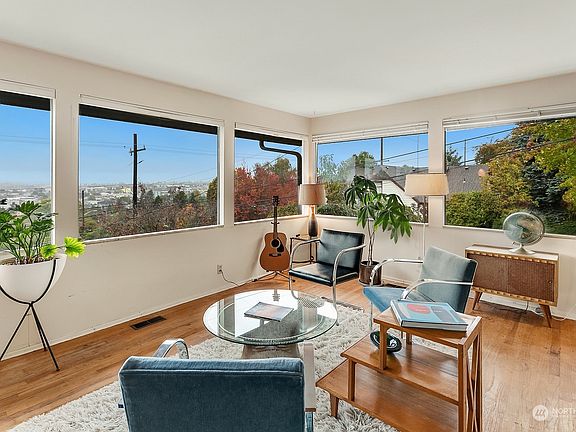 Mid-century modern ranch. Views over ship canal, Ballard, territorial & Olympic Mountains - Fantastic year round sunsets! Stylish Bluestone entry & patio, oak floors, sandstone fireplace built-ins. Original book matched tiger grain kitchen cabinets. Sunny dine in kitchen, second kitchen and M-I-L guest quarters on lower level with living room, den and fireplace. Wall of newer Milgard insulated windows, Newer 50 year metal roof - solar panel ready. Double garage, spacious lot, 2 driveways - RV or boat parking, Hot tub view deck with electrical outlets. Large attic with Douglas fir flooring. Garden spaces, herb gardens. Old growth cedar siding. Super convenient near Phinney, Ballard, Fremont & Ross Park/playground. Style, quality & class.