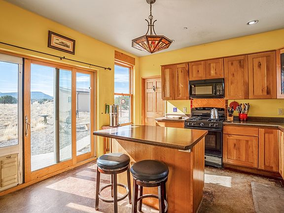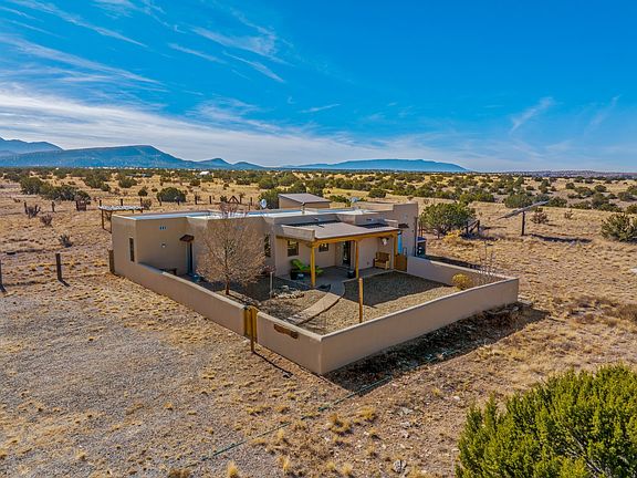 Spectacular mesa top views, privacy and quiet. Off-grid contemporary pueblo-style home on 20 acres, with two detached (192sq/ft each) art studios, solar power, 12,500 gallons of water storage. Home features stained concrete floors, open concept kitchen, banks of south facing windows for passive solar heating. Outside, the front features a shady portal and a walled patio, while the back is fenced for pets, and a rooftop deck provides captivating 360 degree views. 2012 build with newer stucco and newer batteries for the solar system. TPO roof. Water is supplied by catchment. Passive solar and wood stove heats the home, with a propane heater in bathroom and a hook up to add a propane heater to bedroom if desired. 21 miles to Santa Fe, 6 miles to entertainment and dining in Madrid. Internet currently provided by La Canada wireless association.