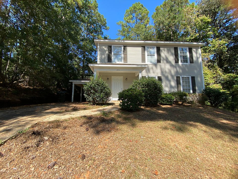 Lake Forest two-story 3/3 AVAILABLE MID-NOVEMBER! Large kitchen with breakfast area that opens up to a large living room. There is a full bathroom downstairs and all three bedrooms upstairs. Single car carport overlooks a large wooded lot.
