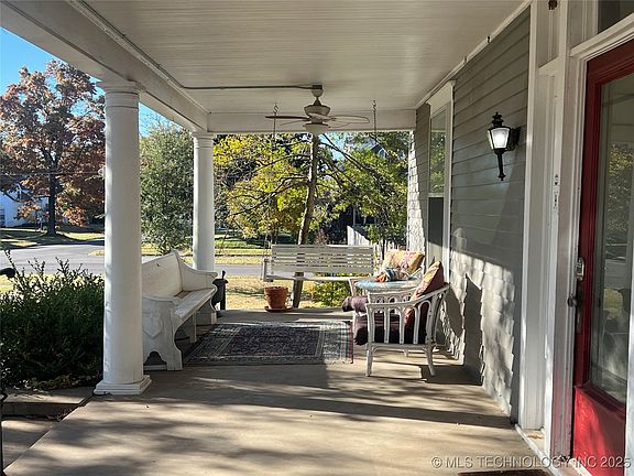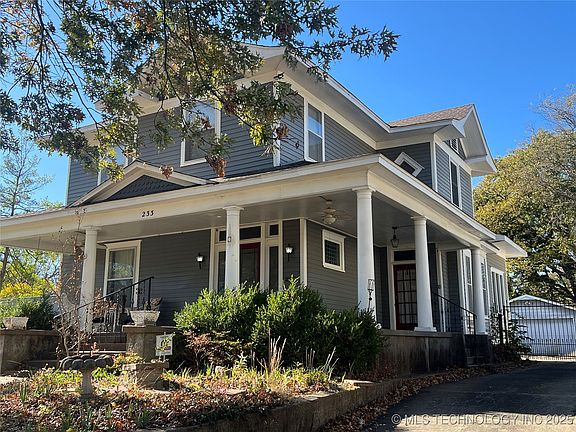 This exceptional historic home in Muskogee's prestigious Kendall Historic District offers two living areas with gas log fireplaces, a formal dining room and a kitchen dining area or office. The natural light throughout this home is stunning with ten foot ceilings and sliding pocket doors that create a wonderful flow between rooms. With abundant windows and elegant architectural details, the classic design allows sunshine to fill the grand airy spaces and the pocket doors add both charm and flexibility. The master suite includes a large walk-in closet and private bathroom. Another full bath is located in the hallway. Relax and enjoy the large wraparound front porch, perfect for entertaining and people watching. The generous property includes a detached two car garage and a storage building complete with electric and RV plug-in on the side.