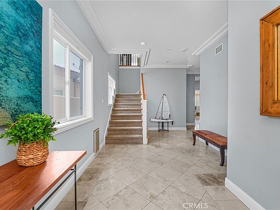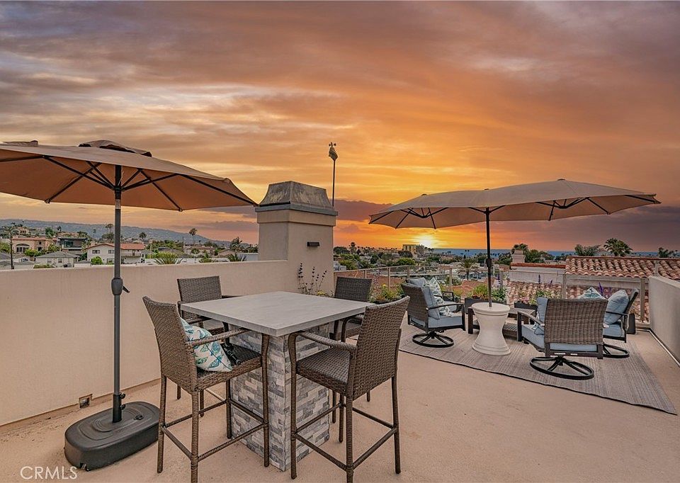 Welcome to rooftop sunsets, ocean breezes, and coastal living. This private rear unit boasts a full-size rooftop and permitted hot tub nestled in the tranquil back patio oasis. Front door entry & direct garage access greets you into a spacious foyer. On this first floor, you will find three bedrooms and a double vanity bathroom. Open the double doors of the third bedroom and step out into the private rear patio, complete with hot tub, artificial turf, and colorful landscaping. Back inside, ascend to the second floor and discover the bright, airy and open living room complete with a fireplace and balcony that flows seamlessly into the well-appointed kitchen. Adjacent is a versatile formal dining room that doubles perfectly as a den or entertainment space. The expansive primary suite beckons with its cozy seating area and a see-through fireplace leading through to the primary bathroom complete with a soaking tub, shower, and dual vanity. Walk upstairs and finally enjoy the Breathtaking panoramic views from the giant rooftop deck. Ocean, sunsets, hillside, city lights—a perfect spot for entertaining or relaxing in solitude. This fantastic coastal neighborhood is known for its excellent schools and local beach life offering you shopping and dining from the marina and the Pier to the village and more. Don't miss out on this opportunity to embrace the ultimate coastal, luxury lifestyle.