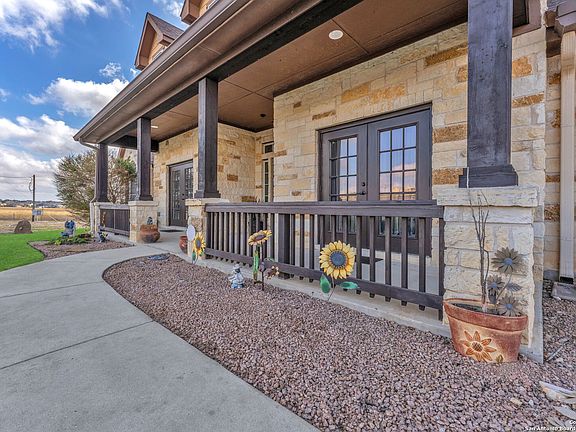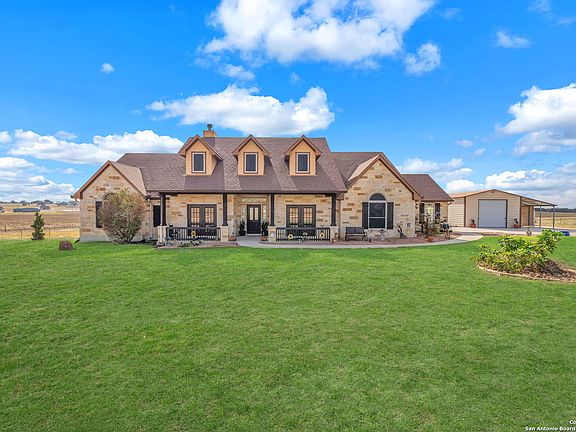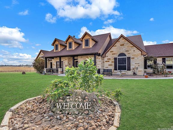 6.29 fenced acres * 4 bd / 3 ba + flex room * mother-in-law suite * sunrise and sunset views * nearly 2,000 sq ft of decking redone. Experience the perfect blend of privacy and country living in this stunning custom single-story home on 6.29 fenced acres within the Triple R Ranch community of La Vernia ISD. Surrounded by neighboring ranchettes and wide-open pastureland, the property offers both sunrise and sunset views across gently rolling terrain. The open-concept layout includes 4 bedrooms, 3 full baths, and a versatile flex room that can serve as an office, media room, or gym. A private mother-in-law suite provides an ideal setup for multi-generational living or long-term guests. Large, strategically placed windows fill every room with natural light while capturing the scenery of surrounding ranch land and livestock that roam nearby, an authentic Hill Country setting. The kitchen features granite countertops, stainless-steel appliances, and a gas cook-top, opening seamlessly to the main living area with fireplace. The primary suite includes a spacious 5 5 dual-head shower and generous closet space. The laundry room offers added storage and an extra set of washer/dryer connections in the garage for flexibility. A 250-lb propane tank powers the furnace, tankless water heater, cook-top, fireplace, and outdoor grill stub-out for efficiency. Outdoors, nearly 2,000 sq ft of newly redone decking connects the entertainment spaces, complete with a pergola, hot tub, and above-ground pool decked on three sides, so it's perfect for year-round gatherings. The property includes an automatic gate opener, enclosed dog run, 20 25 workshop/garage with carport and extended parking pad, 16 16 storage shed, two-car carport with attached storage, an upgraded 325-amp main circuit panel, front-yard sprinkler system, and gutters on both sides. Livestock and horses are commonly seen throughout the surrounding neighborhood, adding to the area's authentic ranch ambiance. Located approximately 0.9 mi to H-E-B grocery and 0.8 mi to Brooster's Coffee on U.S. Highway 87, this home offers easy access to everyday conveniences while maintaining the peace of country life. Nearby La Vernia city center provides shopping, parks, and community events just minutes away, and downtown San Antonio is roughly 35 minutes via Highway 87 or Loop 1604. Includes a video tour for virtual viewing. This property exemplifies what buyers search for in La Vernia homes with acreage, homes with workshops and pools, and Hill Country properties within Floresville ISD, privacy, space, and modern comfort surrounded by open Texas landscape.