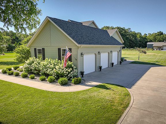 Discover Tranquility in This Updated Home. Nestled on 1.5 acres of serene countryside, this updated 3-bedroom, 2.5-bath home offers modern comfort and timeless charm. A spacious front porch welcomes you to a thoughtfully designed interior with an open-concept layout connecting the foyer, living room, dining area, and kitchen.The spacious kitchen, updated in 2021, features new quartz countertops, open shelving, stainless steel appliances, and ample storage. European-engineered white oak floors flow throughout the main level, enhancing the airy feel created by vaulted ceilings in the foyer and living room. The main floor also includes a primary bedroom with a recently remodeled en-suite bath and a walk-in closet. Six-panel doors with a stained and urethaned finish, along with numerous windows, bathe the home in natural light, creating a warm and inviting atmosphere. The partially finished basement, with tall ceilings, offers versatile spaces for an office, gym, or entertainment area.Step outside to enjoy lush surroundings, including a pergola and a fenced organic garden that supplies fresh fruits, vegetables, and herbs. A 30x40 pole barn, built in 2016, includes a porch, electricity, water, and a concrete floor, providing ample space for hobbies or storage. Additionally, the heated 3.5-car garage, finished with durable polyaspartic epoxy floors in 2023, ensures practicality and convenience.A new roof (installed in 2024, single layer) adds peace of mind to this already well-maintained property.Situated on a quiet country road, this property combines the tranquility of rural living with convenient access to local amenities. Ideal for those seeking a harmonious blend of modern updates and pastoral charm, this home invites you to experience peaceful living in a picturesque setting. Seller is related to the listing broker. Information is believed to be accurate but not guaranteed.