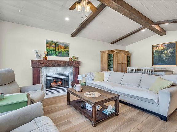 Gas fireplaceVaulted ceilingFaux beamsHuge islandBrand new cabinetryQuartz countersBack patio