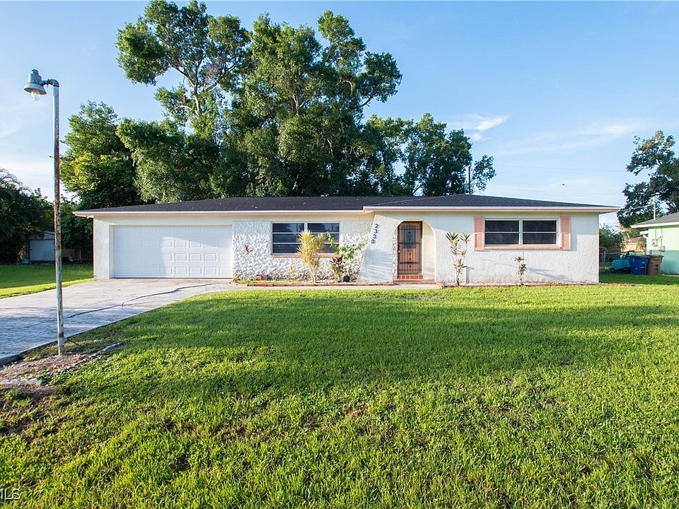This charming 2-bedroom, 2-bathroom ranch-style home in Fort Myers Shores offers the perfect blend of comfort and location. Set on a generous lot, with no HOA restrictions, the key features include new roof (2025), new A/C (2024) and a brand new garage door. This home provides 1,220 sq ft of living space with a functional split-bedroom layout, tile and laminate floors throughout, two full bathrooms and well-sized bedrooms, laundry hookups in the attached 2-car garage with a Florida room overlooking the spacious backyard. Quick access to I-75, downtown Fort Myers, riverfront parks, shopping, and dining all just minutes away.