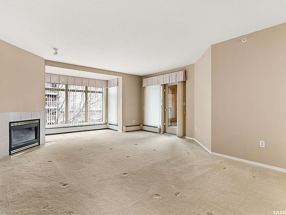 Experience the height of elegant, easy living in this impressive executive condo in the highly sought-after College Park community. Offering 1,338 square feet of thoughtfully designed space, this third-floor unit is filled with natural light and features an open-concept layout ideal for relaxing or entertaining. Step into a grand tiled foyer that leads to the spacious main living area. The inviting living room is anchored by a cozy gas fireplace and a sunlit alcove surrounded by windows—perfect for reading, working, or unwinding. The dining area easily accommodates a large table, while the well-appointed kitchen offers ample cabinetry, white appliances including a built-in oven and cooktop, and generous counter space. A covered east-facing balcony provides a peaceful retreat for morning coffee, complete with a gas BBQ hookup for outdoor dining. The spacious primary suite includes a large walk-in closet and a sleek three-piece ensuite with an oversized shower. A second bedroom offers flexible space for guests or a home office, with a four-piece main bath nearby. Additional conveniences include in-suite laundry with shelving, custom blinds, central air, and elevator access. This condo also includes a 120-square-foot secure storage room and a heated underground parking stall (#31). Residents enjoy an amenities room with games and fitness equipment, a parkade car wash, off-street visitor parking, and a same-floor garbage chute. Steps from Wascana Park, shopping, dining, and essential services, it’s also within walking distance to downtown, Darke Hall, and the refurbished Globe Theatre. Enjoy refined urban living at its best—condo fees cover heat, water, sewer, garbage/recycling, exterior maintenance, lawn care, snow removal, building insurance, and reserve fund contributions. Contact your realtor for more information or a private tour.