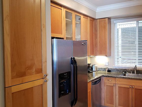 This private corner unit suite offers a fully equipped kitchen with stainless steel GE Profile appliances including a gas stove, oven, dishwasher, modern refrigerator, coffee maker, microwave, garbage disposal and window in the kitchen. There is a pantry, wine rack, in unit laundry facility and plenty of storage. Both bedrooms offer a desk, large closet and dresser. There is a secured entrance and garage with 2 parking spaces assigned.
