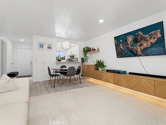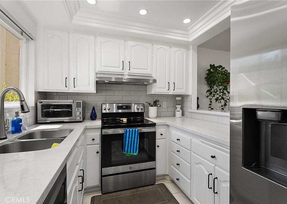 The upgraded kitchen features stainless steel appliances, quartz countertops, a stylish backsplash, modern cabinets, chic tile flooring, and a window passthrough. The spacious living room also has modern floating countertops.