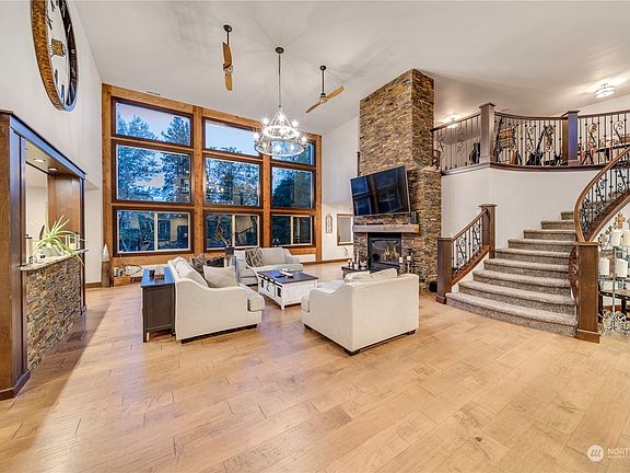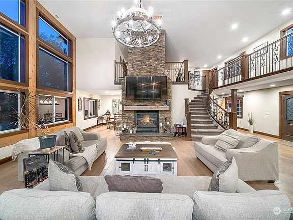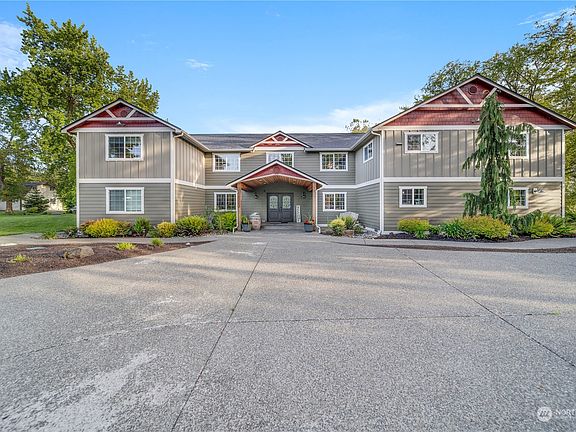 Escape to this lodge-inspired estate, perfectly located for serene living. Enjoy the backyard paradise with your very own fish pond & a small creek bordering the property. This sprawling home offers breathtaking views of Mt. Rainier and a spa-like main bedroom and bath. Entertain in style with a wet bar, a large dining area with a wine bar and cellar, and an expansive kitchen featuring a Viking gas range and Wood Stone gas pizza oven. Relax by the fireplace under soaring ceilings in the living room. Additional income potential from 1 bedroom apartment attached to main home & the detached 870 sq ft home. The lovingly maintained grounds feature a 24x36 barn, a 24x48 four-car garage, and a large loafing shed, with ample RV and tractor parking.