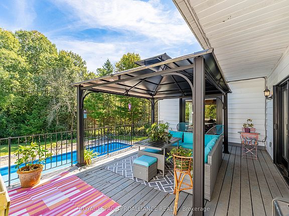This extraordinary 2,584 sq. ft. bungalow is set on a private 1.87-acre lot, offering a rare combination of space, elegance, and lifestyle. The backyard is a true oasis with an inground pool, hot tub, interlock stone patio, Armour stone accents, and an outdoor kitchen an entertainers dream. A winding trail takes you through the trees to a charming bridge over a creek and a sunlit clearing, perfect for gatherings or quiet escapes. Inside, the home showcases high-end finishes including hardwood and travertine flooring, crown moulding, and a thoughtfully designed open layout. At its heart, the gourmet kitchen features a centre island, granite counters, upgraded cabinetry, stainless steel appliances, and a cozy gas fireplace. Sunlight streams through large windows, with a patio door that opens to the deck overlooking the pool and wooded backdrop. Seamlessly connected to the kitchen, the expansive family and dining area offers vaulted ceilings, floor-to-ceiling windows, and a second gas fireplace. This impressive space is ideal for entertaining while maintaining a warm and inviting feel. The bedroom wing includes three generously sized bedrooms and two updated 4-piece baths, each with luxurious finishes. The lower level adds exceptional versatility with a bright living room and walkout to the pool, an additional bedroom, large rec room, office nook, laundry room, and space for a future kitchenette perfect for an in-law suite or multi-generational living. A rare offering that blends elegance, functionality, and resort-style living, this property is truly a must-see.