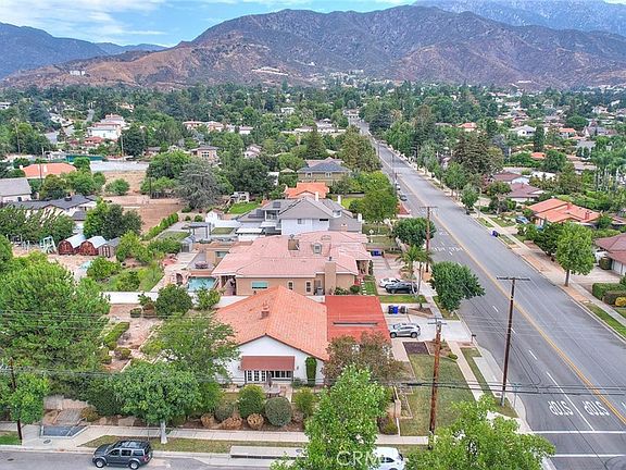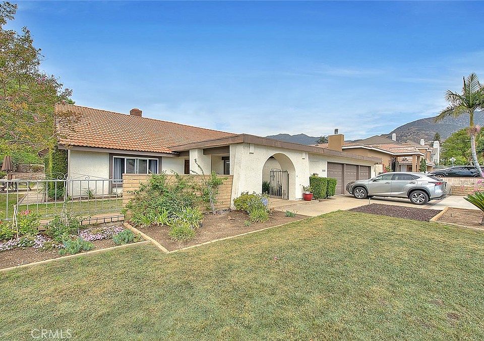 Fantastic 5 bedroom/3 bathroom home situated in the desirable San Antonio Heights area of Northern Upland. You will appreciate the majestic mountain views as you arrive and also while enjoying the outdoors in the sprawling backyard. The lot size is a generous 18,700 sq ft per the assessor records, with a HUGE pool sized level lawn space on the upper level of the backyard. Courtyard entry as you arrive to a unique interior design and wonderful open floor plan. Soaring high ceilings with a centrally located fireplace (3 sided) that creates ambiance whether in the living room, dining area or family room. Newer laminate flooring throughout almost the entire first level of the home. Made to entertain the formal living room and dining area would easily allow for a large group of guests or family. French doors in the formal dining room lead to a spacious side patio, another entertaining location this home enjoys. The kitchen shows light and bright with white cabinetry, upgraded granite counter tops, great storage capabilities as well as an abundance of counter space to work or serve from. The kitchen opens to the family room, a casual & informal spot to relax that features upgraded sliding doors accessing the back patio. The primary suite is expansive with a raised area for retreat with built in display and step down to the sleeping quarters. Featuring 2 closets, private access to the backyard & an upgraded walk in shower that brings the natural light from outdoors inside with oversized windows that face an enclosed courtyard. One bedroom currently used as an office but could be utilized as a bedroom, it is accessed from the living room through shutter doors and has built-ins. Full downstairs guest bathroom with step down shower/tub. The upstairs attic space was converted to a large bedroom complete with ¾ bathroom and closet and would be suitable as a second primary suite or an extended stay for guests.. Other notables include: convenient indoor laundry room, 3 car garage with pull through for additional storage for recreational vehicles or a boat & mature citrus trees on the property. A quick drive to the 210 freeway and local shopping and dining as well. Gorgeous Mt Baldy is approximately 20 minutes drivetime if you desire to escape to the quaint mountain village. Originally built as a single story home with 4 bedrooms and 2 bathrooms on the first floor, one large bedroom and bathroom are located upstairs. (which was converted attic space)
