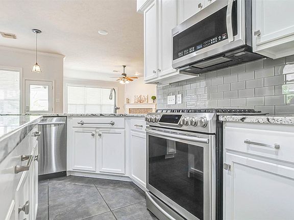 Gas fireplaceStylish backsplashWood flooringStainless steel appliancesCeiling fansGranite countertopsEnormous covered patio