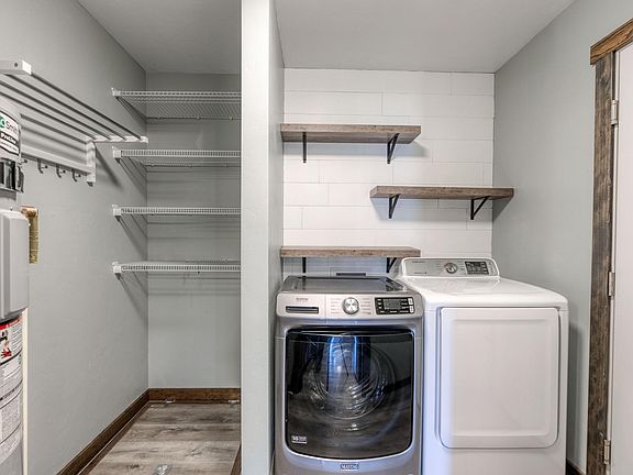 The open concept layout boasts vaulted ceilings and gives the main living area a warm, spacious feel. The stylish kitchen offers a large pantry with sliding barn door, an island with barstool seating, and a generous amount of counter space.