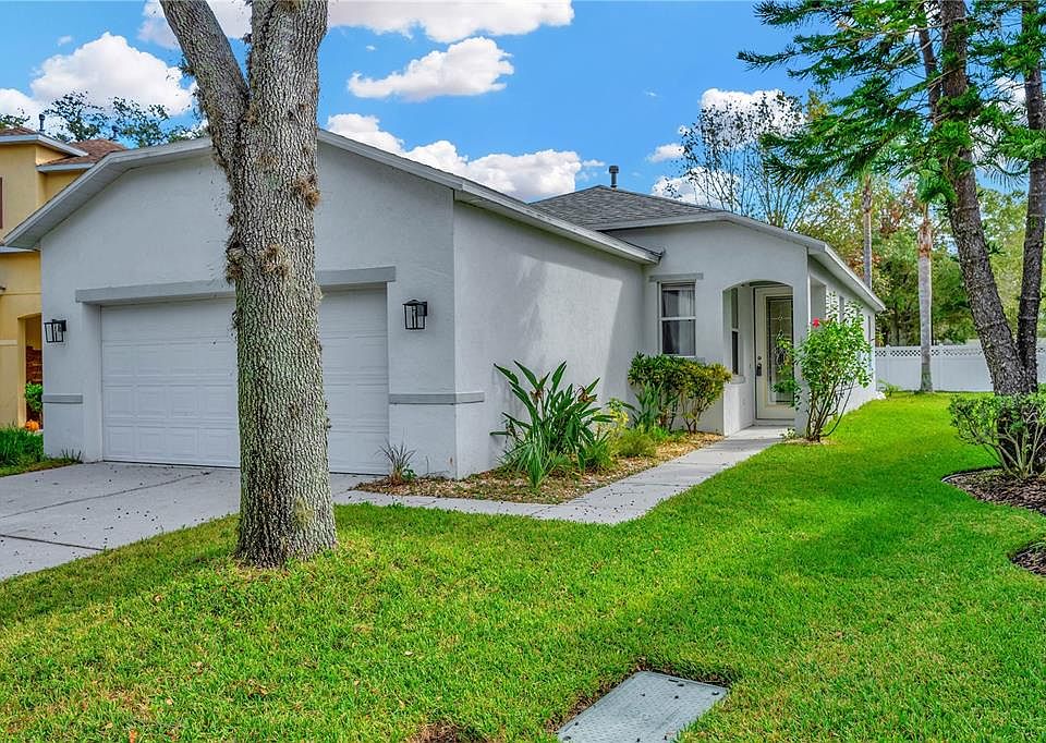 Location, Location, Location! This stunning home is a must-see! Offering 3 bedrooms, 2 bathrooms, a 2-car garage, and 1,541 sq. ft. of living space, this property is packed with features that make it a standout. The versatile bonus room/den can easily serve as an office, playroom, or even a 4th bedroom. You’ll love the open concept feel with volume ceilings and a huge kitchen featuring a breakfast bar and a gas range - perfect for family meals or entertaining guests. This home is ready for you with a new roof and water heater, giving you peace of mind and added value from day one! Step outside to discover a world of possibilities! Just across the street, you'll find a basketball court, park, and playground, perfect for family fun and recreation. The beautifully landscaped neighborhood offers seven resort-style amenities, including sparkling pools, a state-of-the-art fitness center, tennis courts, playgrounds, scenic trails, and more! Conveniently located near everything you need - groceries, Wiregrass Mall, Tampa Premium Outlets, top-notch dining, two major hospitals, and easy access to I-75/275.