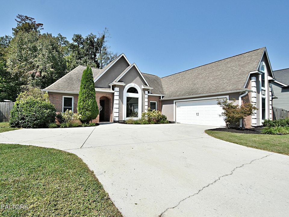This inviting ranch-style home features a versatile bonus room (currently fashioned as a 4th bedroom), two beautifully updated baths, split bedrooms for added privacy, and a master suite with a wood-accented tray ceiling and a tiled walk-in shower—offering both elegance and functionality. The kitchen showcases crisp white cabinetry, granite countertops, wood grain tile, and stainless steel appliances. The heart of the home is the great room, where a cathedral ceiling and gas-log stacked-stone fireplace create a striking ambiance for cozy gatherings.